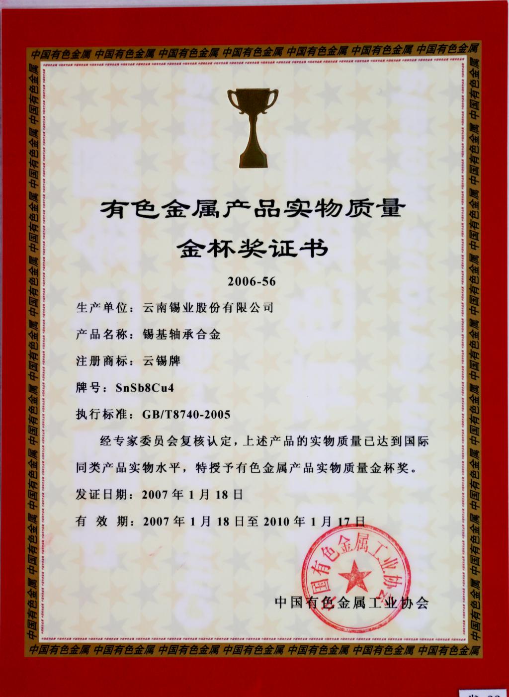 云錫牌錫基軸承合金獲有色金屬實物質(zhì)量金杯獎