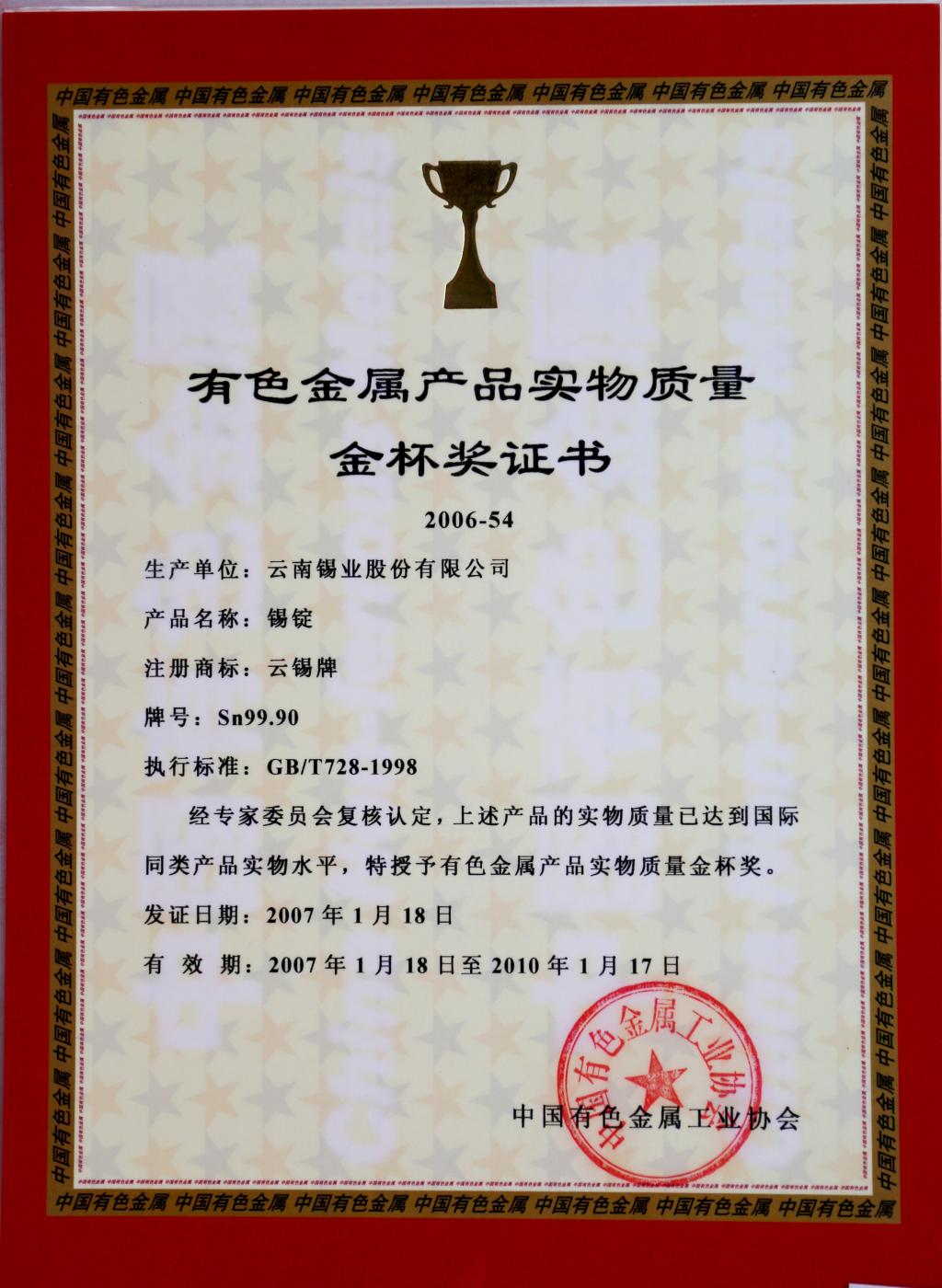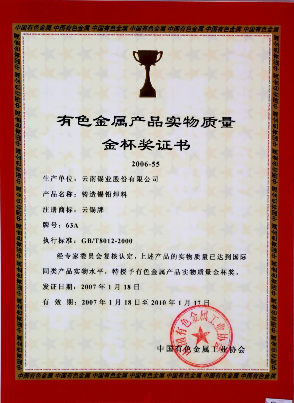 云錫牌鑄造錫鉛焊料獲有色金屬產(chǎn)品實物質(zhì)量金杯獎證書