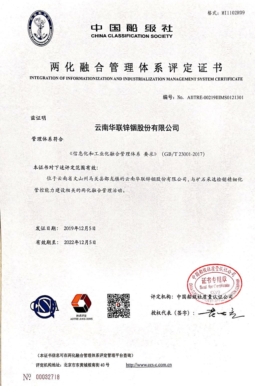 12月5日,華聯(lián)鋅銦公司通過交通部直管事業(yè)單位中國(guó)船級(jí)社兩化融合管理體系認(rèn)證,并頒發(fā)“兩化融合管理體系認(rèn)證證書”,成為文山州第一家通過該項(xiàng)體系認(rèn)證的成員企業(yè)。