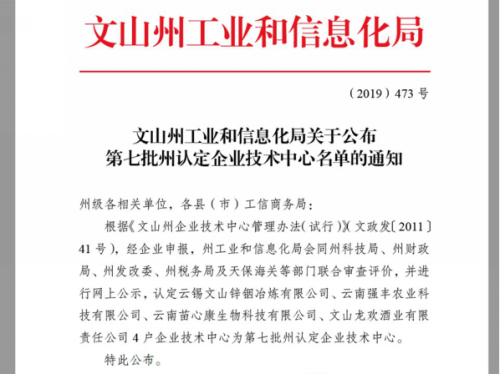 近日,云錫文山鋅銦冶煉有限公司同云南強豐農(nóng)業(yè)科技有限公司、云南苗心康生物科技有限公司、文山龍歡酒業(yè)有限責(zé)任公司4家企業(yè)獲第七批州認定企業(yè)技術(shù)中心榮譽稱號。