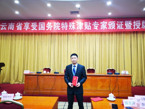 4月12日,在云南省2018年獲國(guó)務(wù)院政府特殊津貼專家頒證暨新設(shè)立專家基層科研工作站和省級(jí)博士后站授牌活動(dòng)會(huì)上,老廠分公司竹葉山坑一工區(qū)采礦一隊(duì)隊(duì)長(zhǎng)、高級(jí)技師楊勇榮獲2018年國(guó)務(wù)院政府特殊津貼。云南省人社廳黨組副書記、副廳長(zhǎng)和江峰、副廳長(zhǎng)邢渭東、省委組織部人才工作處處長(zhǎng)肖峰出席活動(dòng)并為2018年榮獲享受國(guó)務(wù)院政府特殊津貼的48位各行各業(yè)專家人才現(xiàn)場(chǎng)頒發(fā)證書。