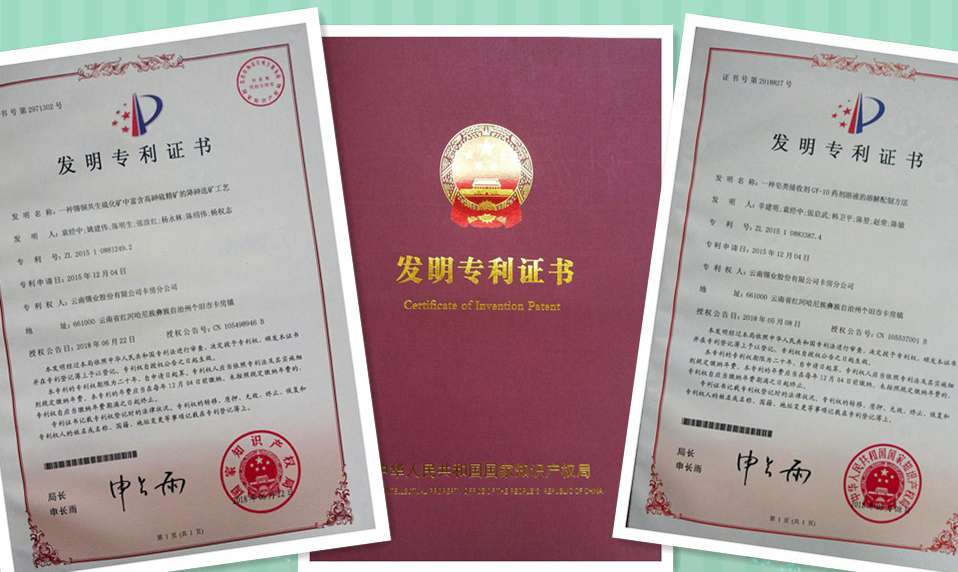 近日,卡房分公司申報(bào)的發(fā)明專利《一種共生硫化礦中富含高砷硫精礦的降砷選礦工藝》《一種皂類捕收劑GY-10藥劑溶液的溶解配制方法》獲得國(guó)家知識(shí)產(chǎn)權(quán)局正式授權(quán),并被授予國(guó)家發(fā)明專利證書。