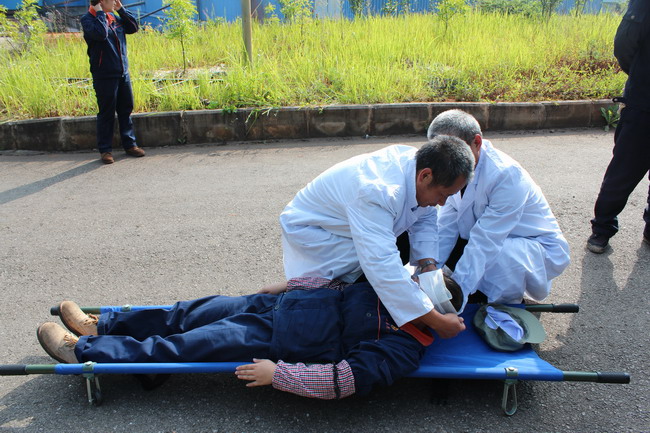 反恐小組趕到出事地點(diǎn)后,警戒保衛(wèi)組立即組織現(xiàn)場無關(guān)人員撤離,同時(shí)設(shè)置警戒線。副總指揮何文勇向車內(nèi)的“暴恐分子”喊話,要求他們放棄抵抗,繳械投降,其中一名“暴恐分子”見勢不對,亮出隨身藏匿的刀具挾持人質(zhì)下車準(zhǔn)備逃跑時(shí),被抓捕一組的3名保衛(wèi)人員利用防爆盾牌、防爆叉等工具將其攔阻控制,車內(nèi)剩余兩名“暴恐分子”也隨即被抓捕二組保衛(wèi)人員制服收押,成功解救被挾持的三名職工,并把其中被“暴恐分子”刺傷的一名職工抬到安全區(qū)域由醫(yī)療救護(hù)組隊(duì)員進(jìn)行現(xiàn)場救治,隨后迅速將傷員轉(zhuǎn)移至醫(yī)院進(jìn)一步救治。