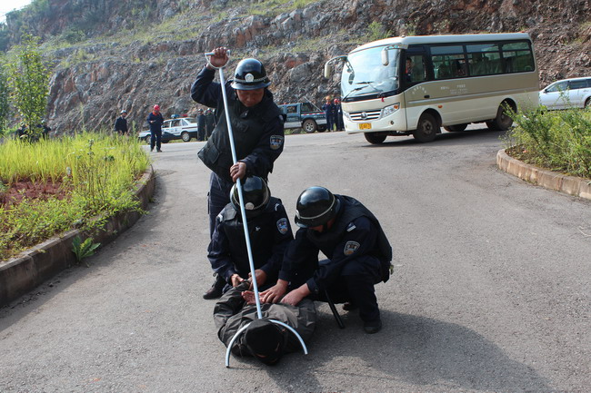 演練設(shè)置為早上9點(diǎn)30分左右,在通勤車乘坐點(diǎn),一群身份不明的人員在職工乘坐通勤車下班時(shí)進(jìn)行突然襲擊,對車間設(shè)施進(jìn)行破壞,其中3名“暴恐分子”在中巴車內(nèi)挾持了3名職工,守護(hù)精選工段的保衛(wèi)人員接到報(bào)警后,兩名保衛(wèi)人員立即對恐怖分子進(jìn)行阻擊,另外一名保衛(wèi)人員立即把情況上報(bào)給反恐小組辦公室,反恐領(lǐng)導(dǎo)小組迅速啟動應(yīng)急方案。