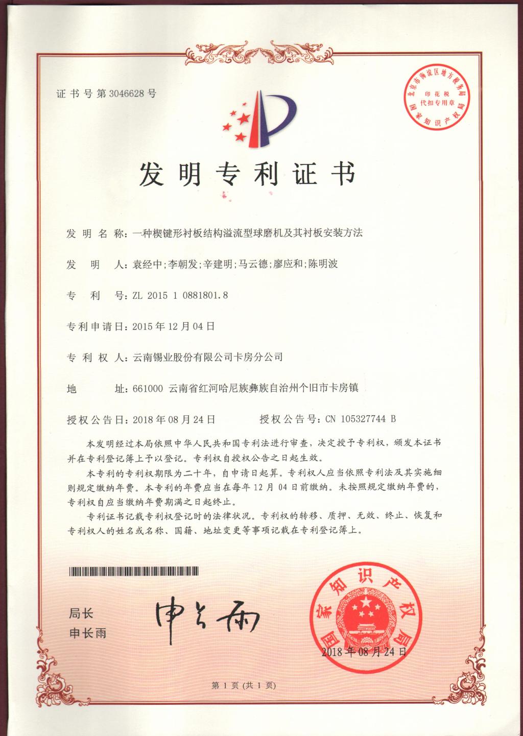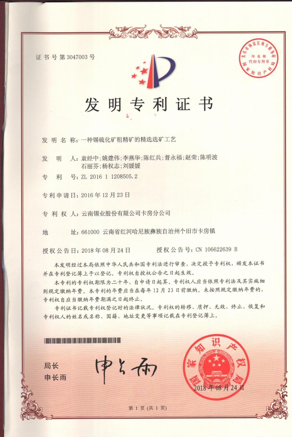 近日,卡房分公司申報(bào)的發(fā)明專利《一種楔鍵形襯板結(jié)構(gòu)溢流型球磨機(jī)及其襯板安裝方法》《一種錫硫化礦粗精礦的精選選礦工藝》再獲國家知識(shí)產(chǎn)權(quán)局正式授權(quán),并授予國家發(fā)明專利證書。這是今年繼8月份該分公司申報(bào)的發(fā)明專利《一種共生硫化礦中富含高砷硫精礦的降砷選礦工藝》《一種皂類捕收劑GY-10藥劑溶液的溶解配制方法》獲國家發(fā)明專利證書之后,再獲兩項(xiàng)發(fā)明專利授權(quán)。
