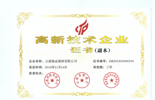 2018年,錫材公司經(jīng)過(guò)評(píng)審、公示,再次獲得認(rèn)定,取得“高新技術(shù)企業(yè)證書(shū)”。自2009年錫材公司首次申報(bào)高新技術(shù)企業(yè)并獲得認(rèn)定開(kāi)始,已連續(xù)四次申報(bào)成功,一共連續(xù)12年位居高新技術(shù)企業(yè)之列。