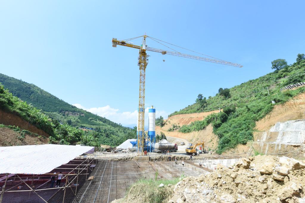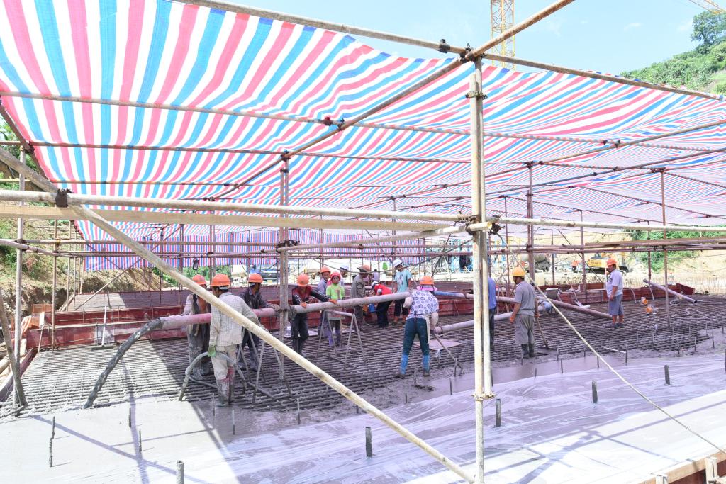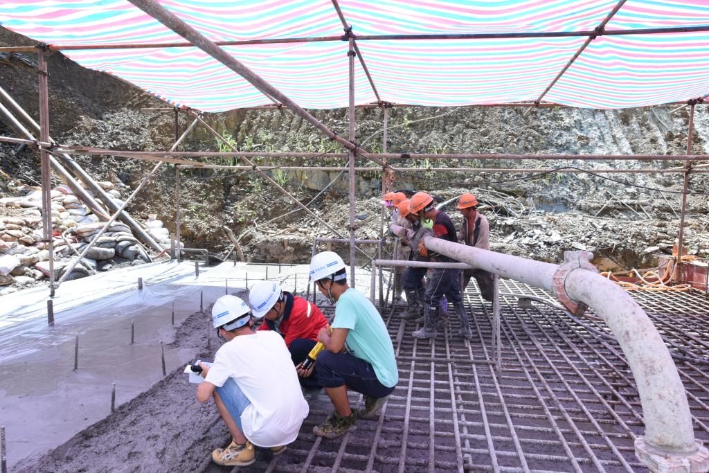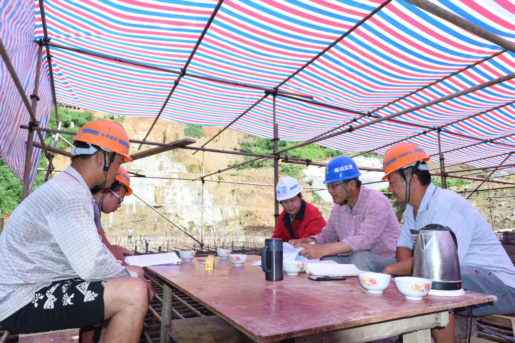 象沖尾礦庫白天高峰時氣溫接近40攝氏度,熾灼的陽光炙烤著場地的每一個角落,盡管現(xiàn)場搭起了大棚,但噴灑混凝土的振動棒依然被曬得發(fā)燙,作業(yè)人員們手上的塑膠手套換了一雙又一雙,比起高溫的太陽,這里的人們更喜歡月亮,大自然最好的饋贈當(dāng)屬夜里送爽的清風(fēng)。由于澆灌需一次成型,60余名作業(yè)人員分為三個小組24小時不間斷連續(xù)作業(yè),一張用層板拼接的簡易桌子成為現(xiàn)場指揮、提供補(bǔ)給的港灣,指揮調(diào)度、輪班值守、就餐休息都倚靠這張木桌。佇立的機(jī)車、堅定的腳步、忙碌的身影,勾繪出建筑工地上24小時不停作業(yè)的剪影。