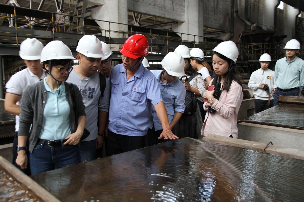 學員們先后參觀了熔煉車間精礦倉、反射爐舊址、頂吹爐主控室、精煉車間電熱連續(xù)結晶機、圓盤自動澆鑄機及錫庫,詳細了解了錫冶煉流程的設備原理、操作控制、工藝原理、入爐原料品位等方面情況。