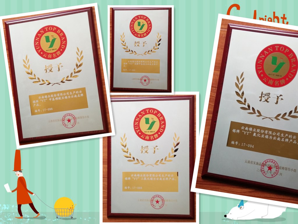 2017年,錫業(yè)股份品牌建設(shè)工作持續(xù)取得成效,新申報的甲基磺酸亞錫產(chǎn)品通過云南省名牌戰(zhàn)略推進委員會審核,被評為云南名牌產(chǎn)品,氯化亞錫、硫醇甲基錫、二氧化錫產(chǎn)品通過復(fù)評,保持證書獲得表彰。