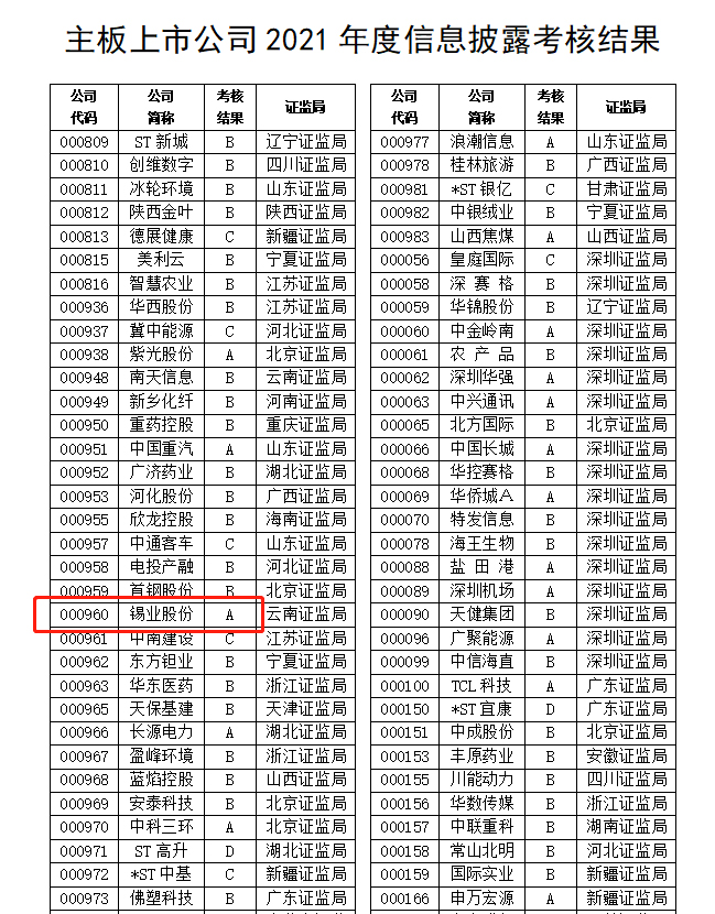 7月4日,深圳證券交易所發(fā)布了《2021年度上市公司信息披露考核結(jié)果》,錫業(yè)股份(000960)考核評價結(jié)果為最高等級A級,自2017年之后再次回到信息披露考核最高等級陣營。從考核結(jié)果統(tǒng)計來看,深市上市的2,553家公司中考核結(jié)果為A(優(yōu)秀)的公司家數(shù)僅為454家,占參加考核上市公司總數(shù)的17.78%。其中,云南轄區(qū)考核結(jié)果為A的深市上市公司僅有5家。