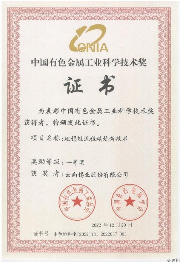 近日,中國有色金屬工業(yè)協(xié)會、中國有色金屬學(xué)會發(fā)布了榮獲2022年度中國有色金屬工業(yè)科學(xué)技術(shù)獎項目,由云錫控股公司牽頭負(fù)責(zé),錫業(yè)股份錫業(yè)分公司、昆明理工大學(xué)、綠地環(huán)保共同參與的“粗錫短流程精煉新技術(shù)項目”榮獲2022年度“中國有色金屬工業(yè)科學(xué)技術(shù)獎一等獎”。