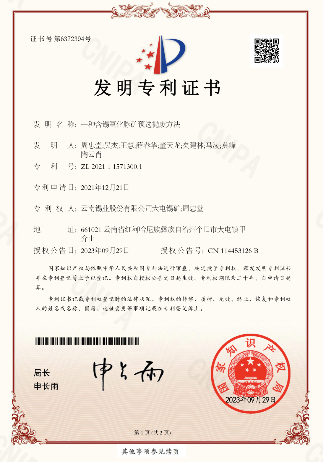 9月29日,繼大屯錫礦研發(fā)的“一種銅錫共生硫化礦預(yù)選分級選礦方法”發(fā)明專利于2023年6月獲國家知識產(chǎn)權(quán)局正式授權(quán)的基礎(chǔ)上,大屯錫礦“一種含錫氧化脈礦預(yù)選拋廢方法”再獲國家發(fā)明專利!