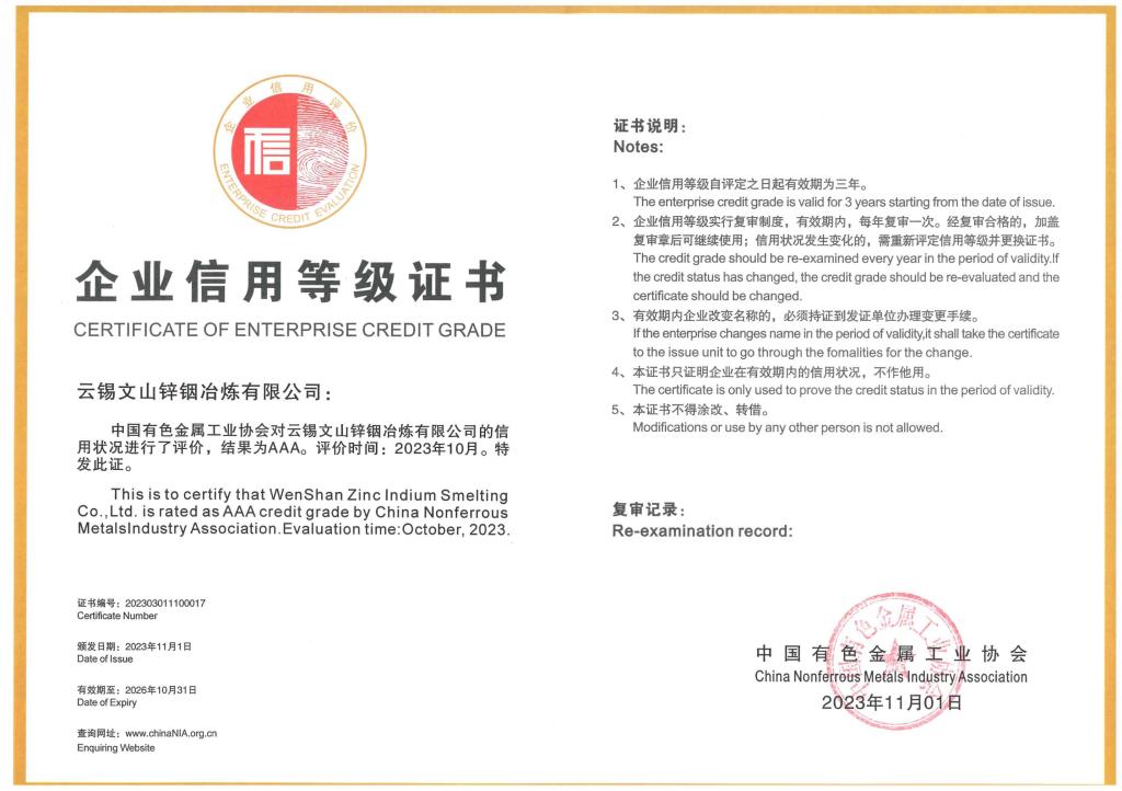 近期,文山鋅銦公司獲得中國有色金屬工業(yè)協(xié)會(huì)“AAA級信用企業(yè)”證書,得到行業(yè)協(xié)會(huì)權(quán)威認(rèn)證,標(biāo)志著文山鋅銦公司在誠信經(jīng)營、規(guī)范經(jīng)營等方面取得重要階段性成果。
