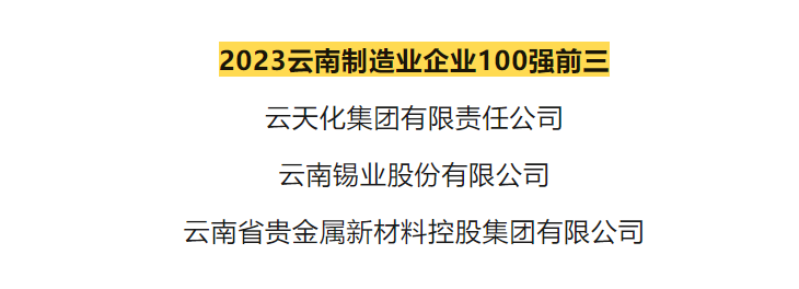 近日,由云南省企業(yè)聯(lián)合會(huì)、云南省企業(yè)家協(xié)會(huì)公開發(fā)布的“2023云南企業(yè)100強(qiáng)”新鮮出爐。錫業(yè)股份位列2023云南高新技術(shù)企業(yè)100強(qiáng)第1位,2023云南制造業(yè)企業(yè)100強(qiáng)第2位。