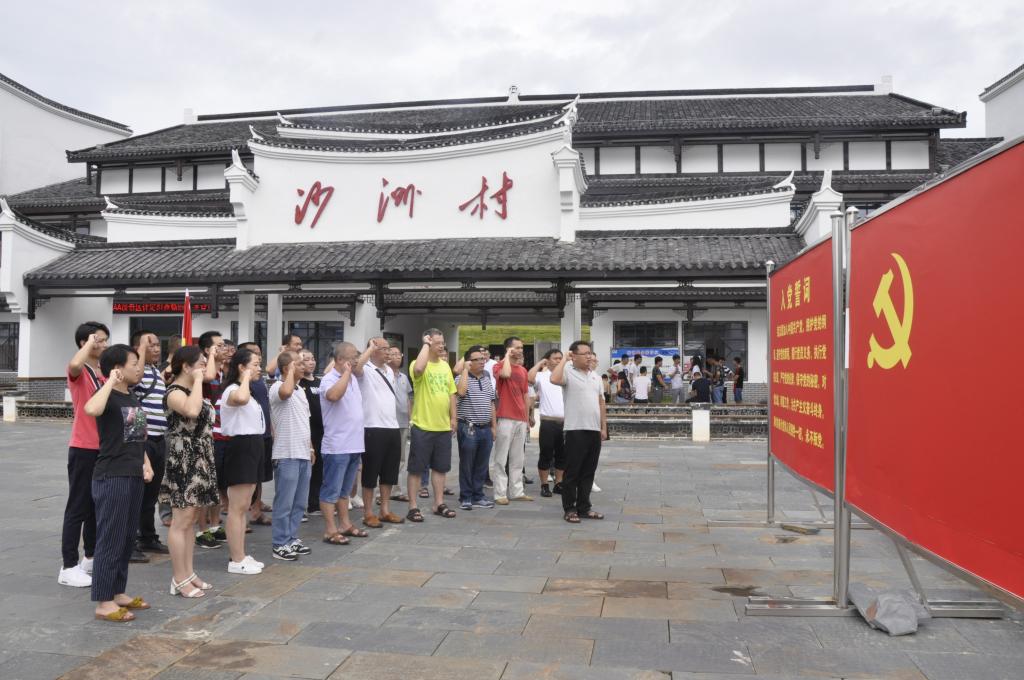隨后,在沙洲村廣場(chǎng)前,全體黨員莊嚴(yán)地舉起右手,面向黨旗重溫入黨誓詞。