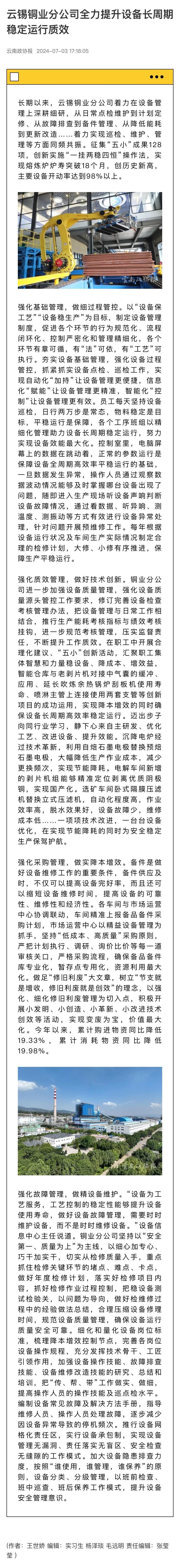 云南政協(xié)報(bào)、有色新聞:云錫銅業(yè)分公司全力提升設(shè)備長(zhǎng)周期穩(wěn)定運(yùn)行質(zhì)效